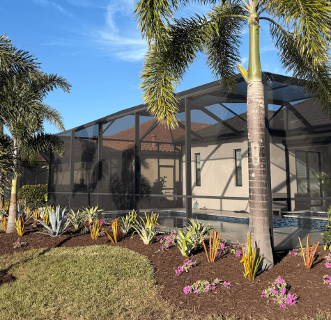 Landscaping around a screened pool in Florida looks best when the planting stays low and tidy, the bed lines match the lanai geometry, and the view stays open from inside…