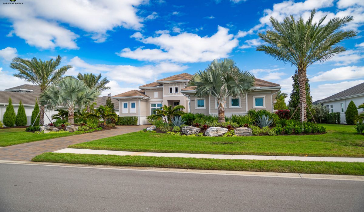 Instead of treating the yard as one open lawn, thoughtful landscape design uses island beds, structured palms, and layered plantings to guide the eye naturally toward the home.